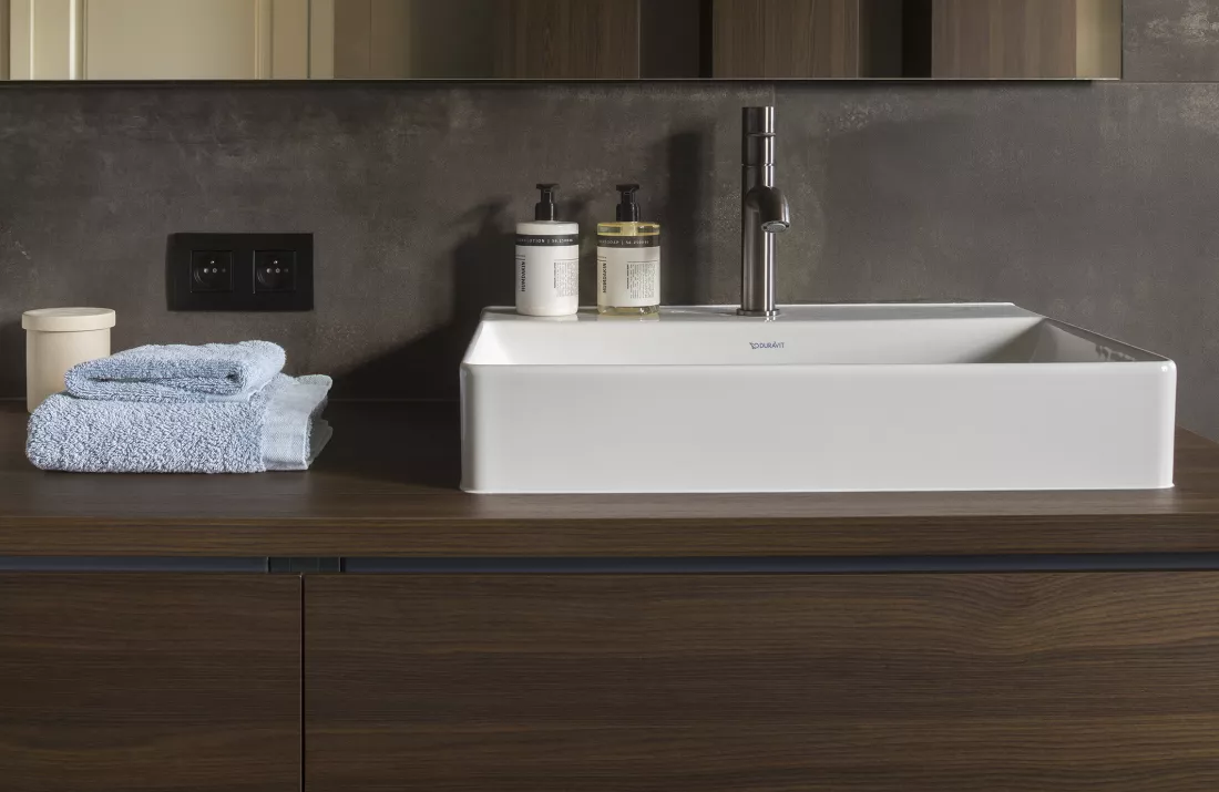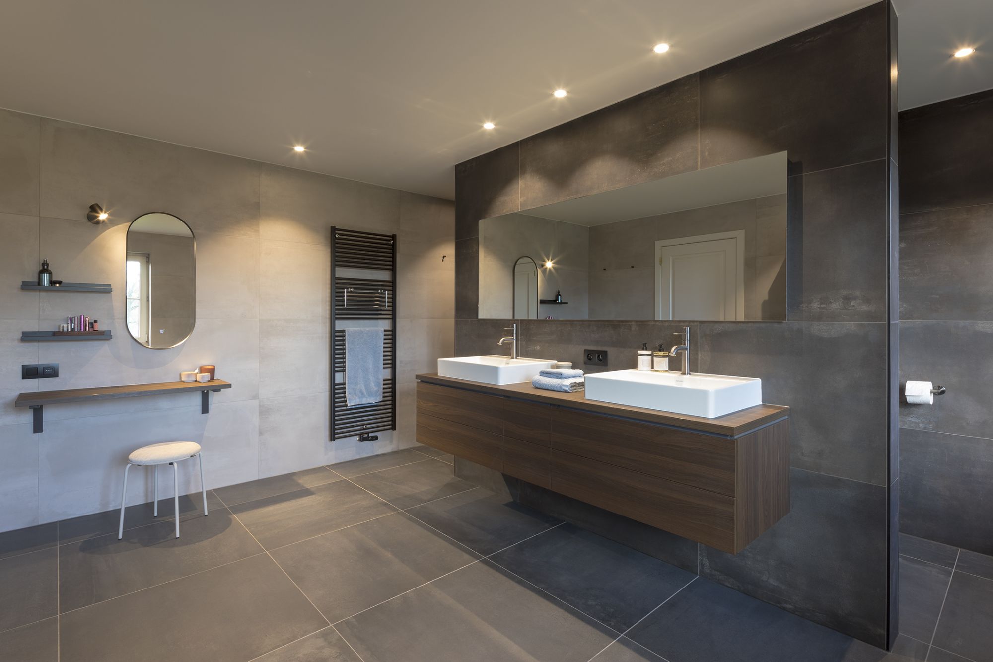 - Tegen deze wand plaatsten we een ruim badkamermeubel in notenhoutfineer met twee opzetwastafels.