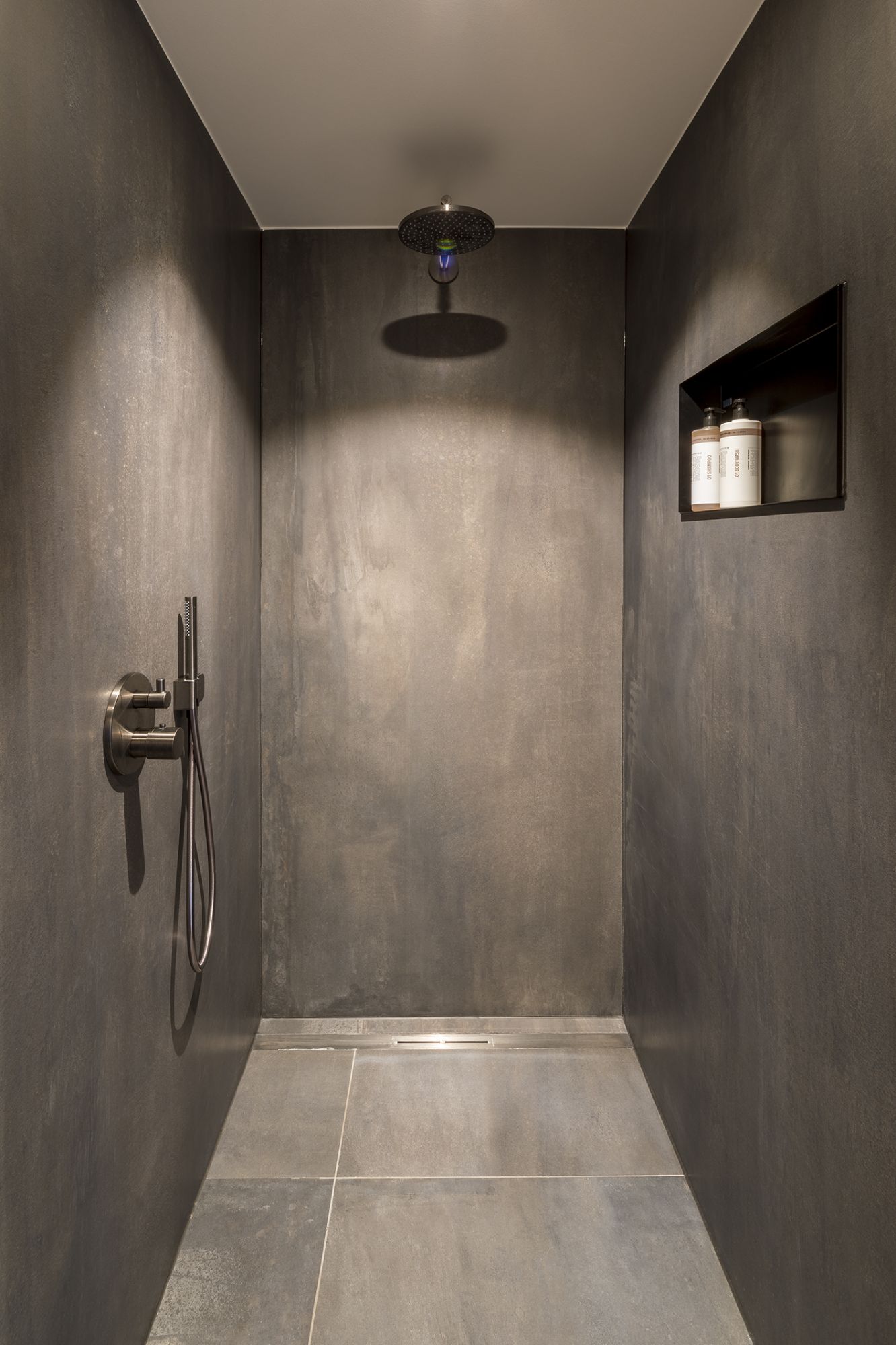 - Een stijlvolle tussenwand verbergt het toilet en de royale inloopdouche.