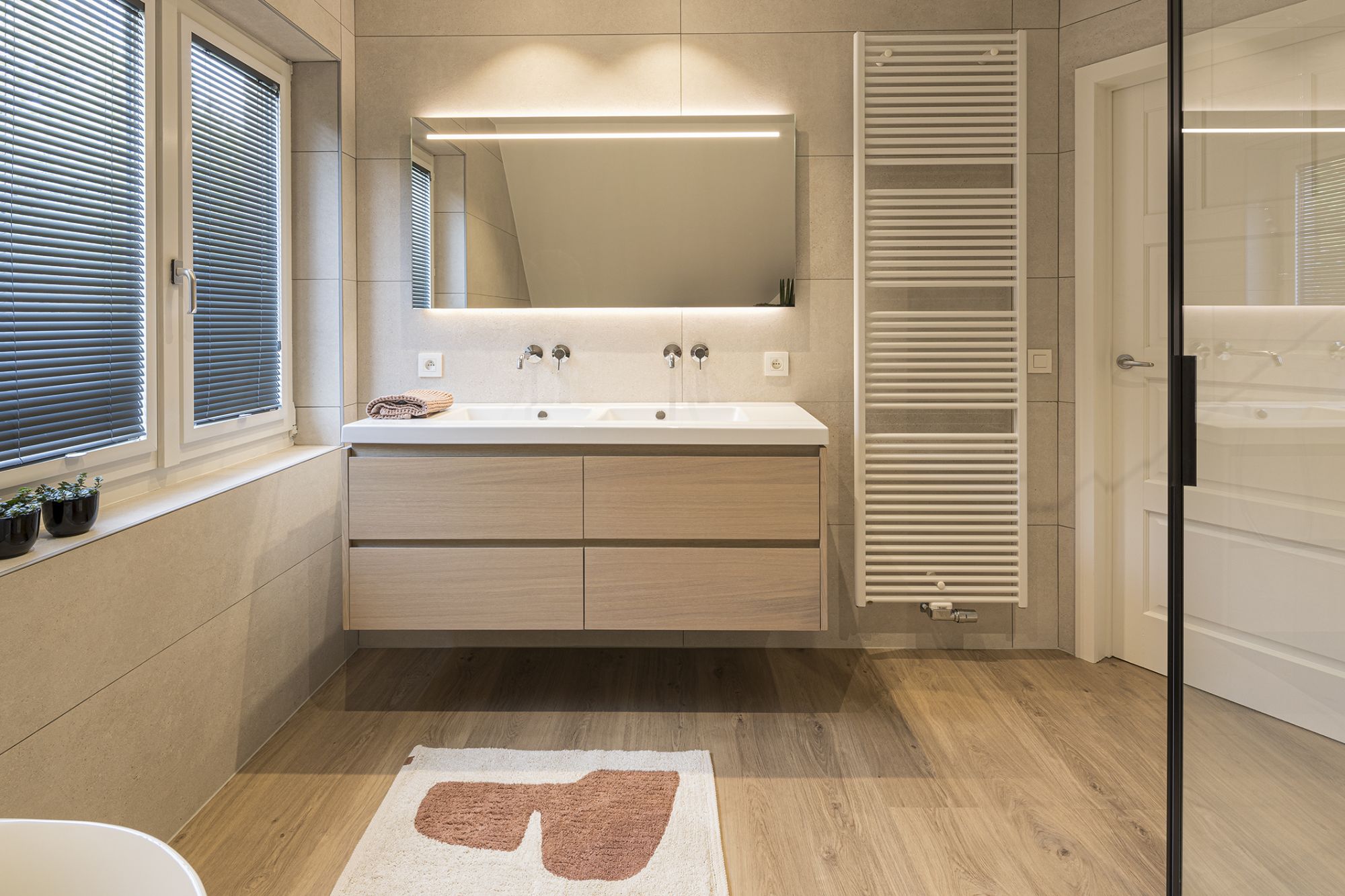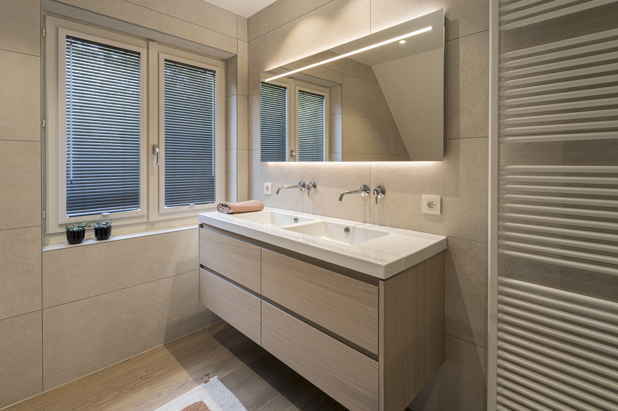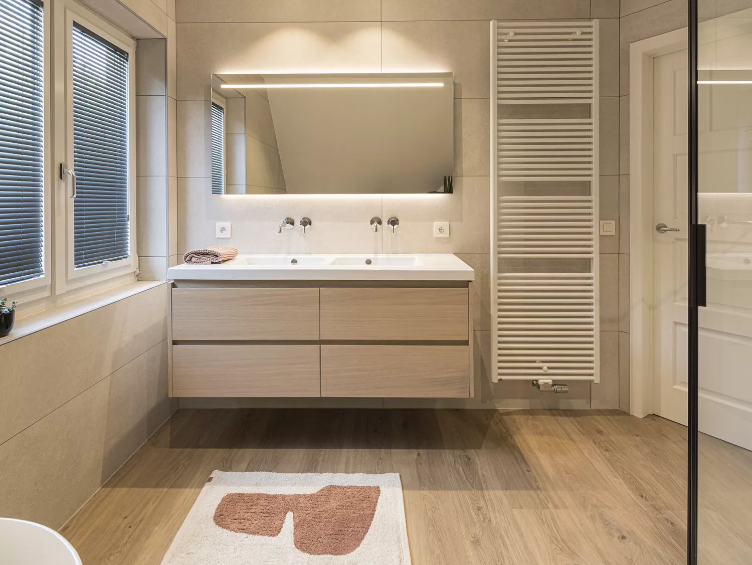 - Een dubbele wastafel met royaal meubel biedt voldoende aflegruimte en opbergruimte.