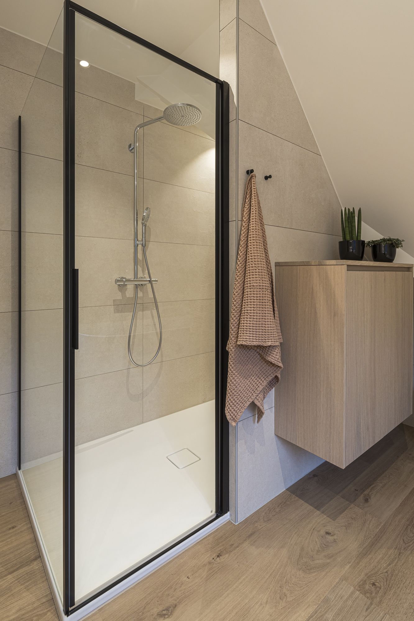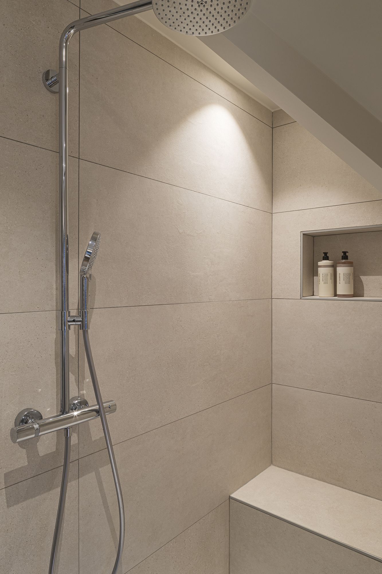 - Onder het nieuwe gyproc dak plaatsten we een ruime inloopdouche met een handige nis en zitje, perfect ingewerkt onder de schuine wand.