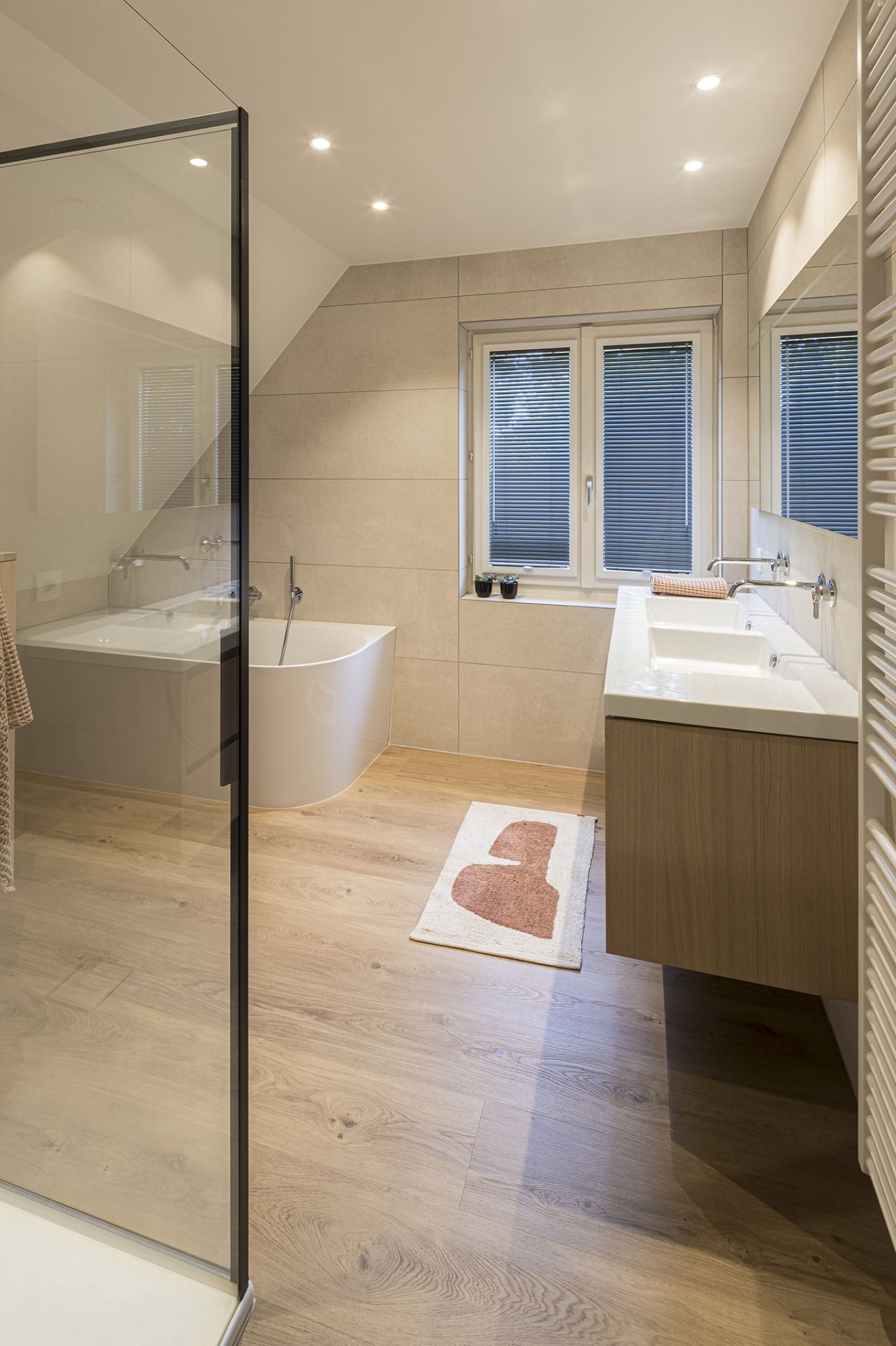De badkamer voelt ruimer en rustiger aan, ondanks het schuine dak. De bewoners genieten van een warme, gezellige ruimte waar comfort en stijl samenkomen – en van een vernieuwd gastentoilet in dezelfde verfijnde sfeer.