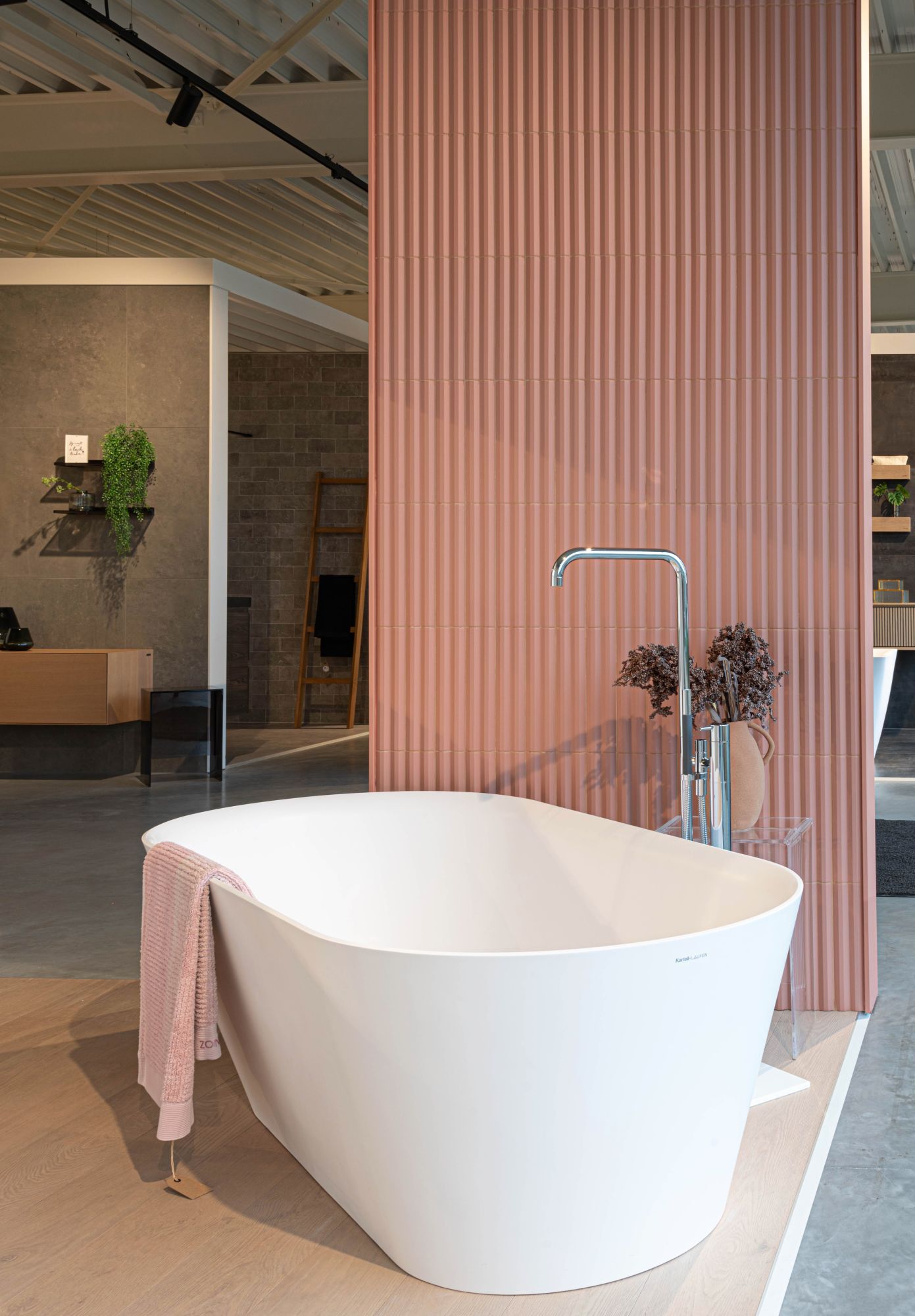 Het mat witte vrijstaande ligbad vormt het hart van deze badkamer. De zwarte elementen uit de Tara-reeks naar een ontwerp van Sieger Design en het eiken meubel zorgen voor een subtiel contrast met de stijlvolle ABK-tegels.